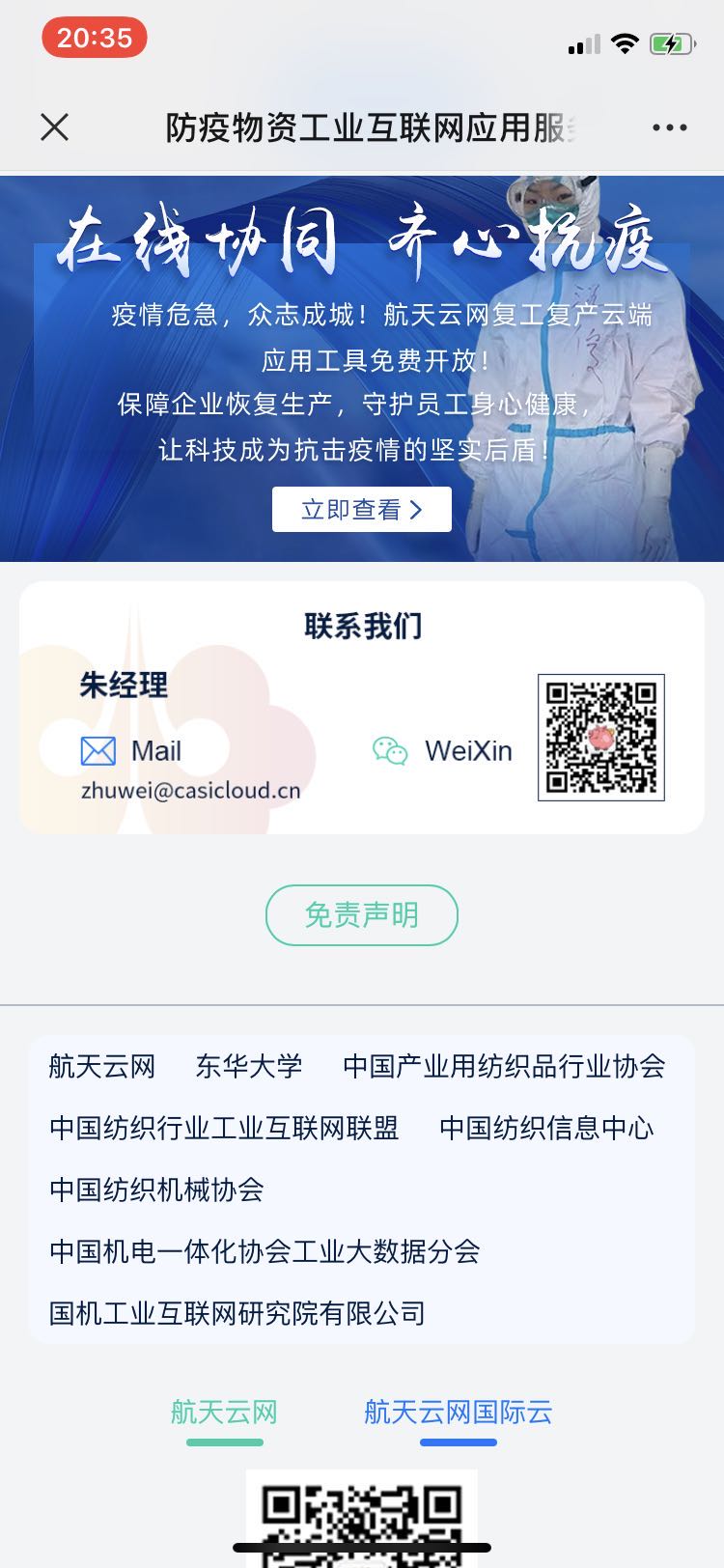 疫情爆发牵动着东华机械人的心。太阳成集团tyc33455cc官网经理张洁教授和智能制造研究所所长鲍劲松教授在大年初六(1月30日)紧急商讨如何利用现有研究成果和资源,为快速提升防疫物资产能贡献力量。商讨决定要发挥工业互联网技术优势,建设防疫物资工业互联网应用服务平台,提供透明准确的防疫物资产能情况,有效解决防疫物资保障工作中“缺材料、缺设备、缺专家、产能低”的问题,将团队从事工业大数据技术、工业互联网、制造资源调度、纺织服装领域网络化协同制造的研究成果应用于平台建设。之后,张洁教授和鲍劲松教授组织智能制造研究所老师,形成防疫物资工业互联网应用服务平台的建设方案,并汇报给俞建勇董事长。俞董事长在第一时间回复,给予了大力支持。中国产业用纺织品协会李桂梅副会长、太阳成集团tyc33455cc官网情报研究所张福元老师提供了帮助。同时,张洁教授和鲍劲松教授组织了外部资源,联合中国产业用纺织品协会、中国纺织品工业互联网联盟、中国纺织工业联合会信息中心、中国纺织机械协会,中国机电一体化协会工业大数据分会等行业单位组织,以及航天云网、国机工业互联网研究院有限公司等知名工业互联网技术单位,共同建设 “医疗卫生用纺织品防疫物资工业互联网应用服务平台”(以下简称“平台”)。