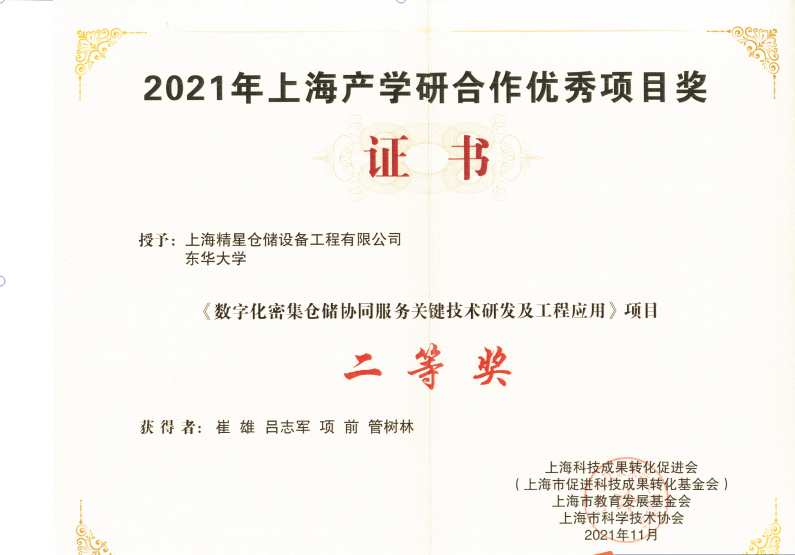 20211210日,上海产学研合作优秀项目奖表彰大会在市政协举行,大会共评选出30个获奖项目。公司吕志军副教授团队与上海精星仓储设备工程有限公司合作的《数字化密集仓储协同服务关键技术研发及工程应用》获“2021年上海产学研合作优秀项目奖”二等奖。
