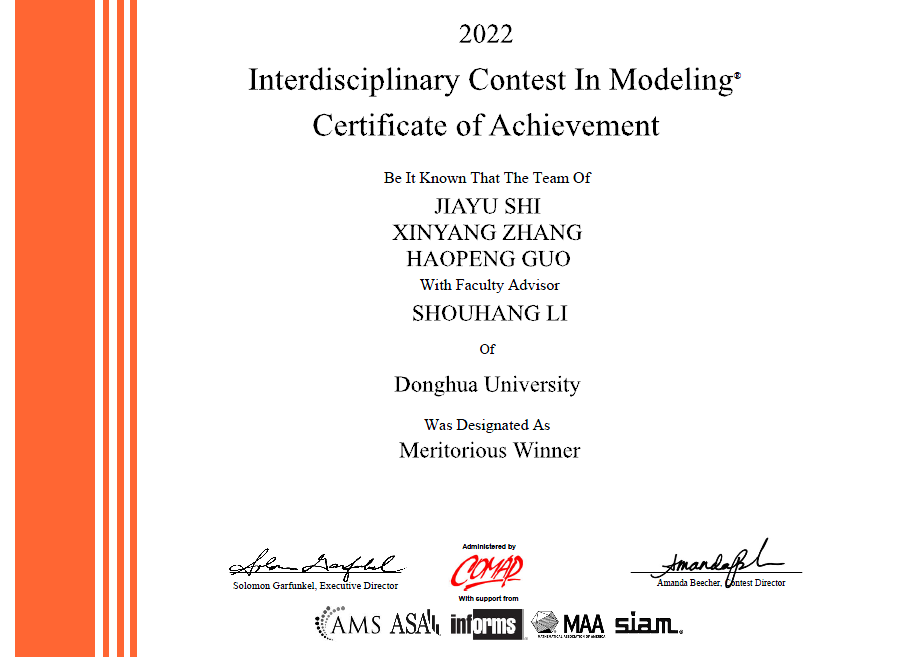 近日,2022年美国老员工数学建模竞赛成绩揭晓,由太阳成集团tyc33455cc官网青年教师李寿航带领公司施家瑜、郭浩鹏和计算机公司张欣旸三位同学组成团队,在与全球众多高校学子的竞争中脱颖而出,荣获一等奖。