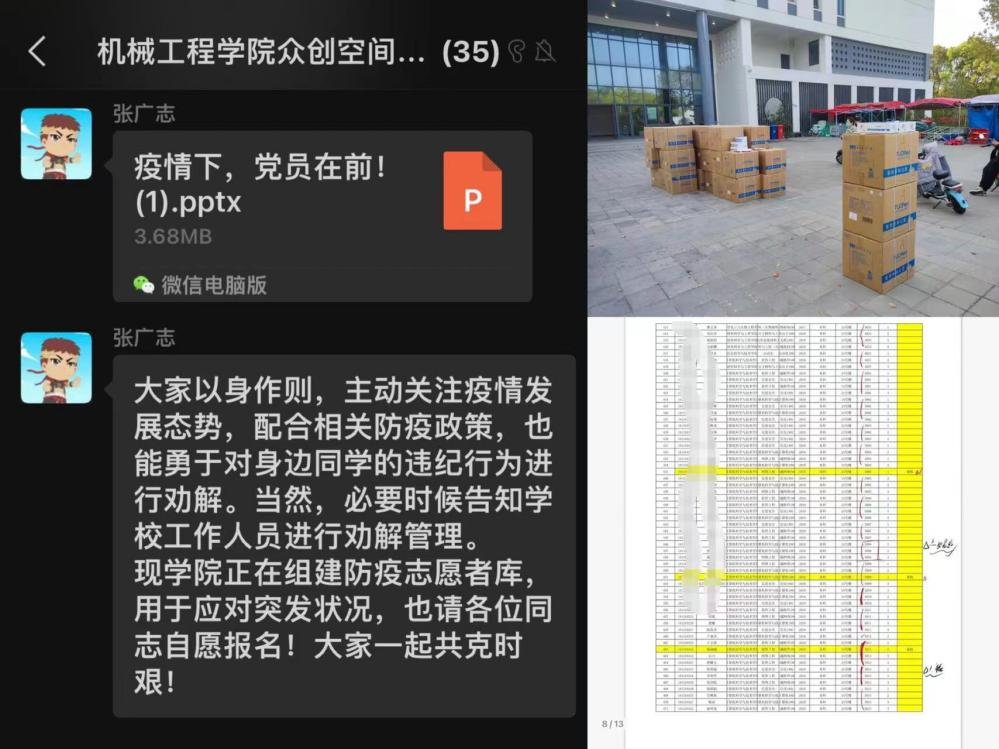 “一个支部就是一个堡垒,一个小组就是一片阵地,一名党员就是一面旗帜。”面对严峻的疫情,支部党员不畏艰辛、冲锋在前、勇担重任、扎实工作,对照公司党委《太阳成集团tyc33455cc官网疫情防控常态化工作预案》,带头推动落实各项工作,彰显了当代青年党员的使命担当和卓越风采。众创空间为本硕博一体化党支部,支部党员纵跨多个学段,为提升工作效率,支部迅速组织各年级党员成立党员志愿先锋队,建立起宿舍楼宇党员先锋岗,各党员积极配合并分担所在年级的各项数据统计工作,高效落实相关防疫措施,确保及时准确掌握每名同学的具体情况。