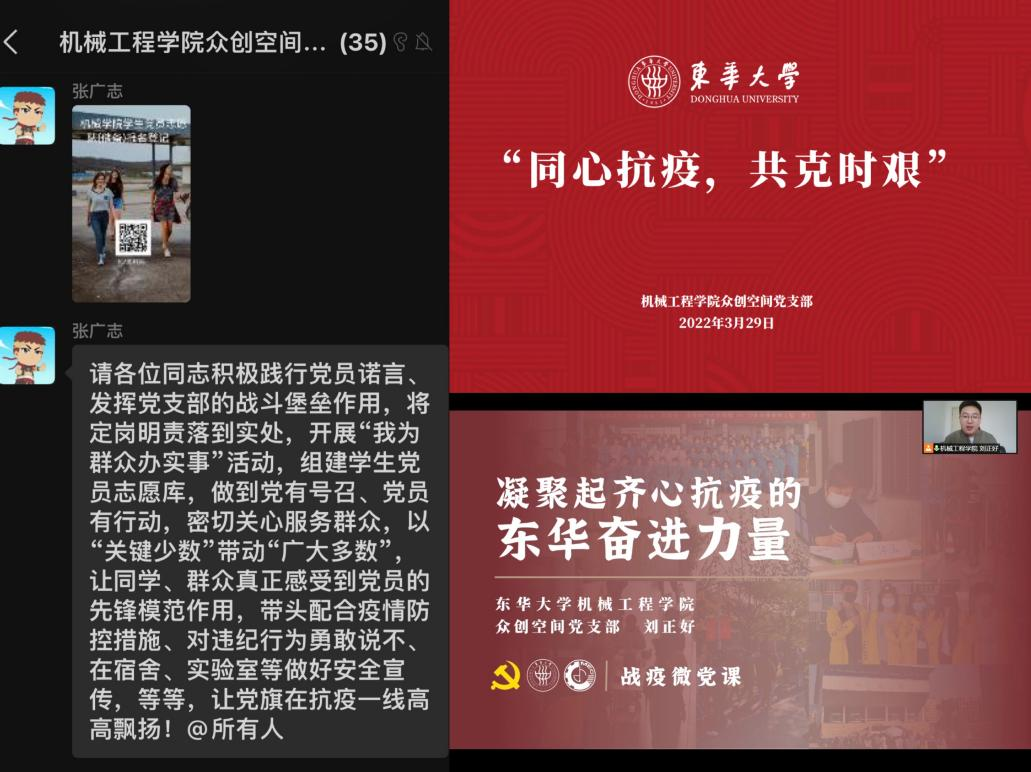 “是你们与‘大白’强强联手,一次又一次见证核酸检测‘东华速度’,守护春日里的‘东华平安’!”在参与疫情防控工作中,支部涌现了一批先锋模范党员,有自封校以来长期坚守在全校核酸检测志愿者组织工作岗位上的硕士生党员刘正好,他也是二号研究生公寓的驻楼兼职辅导员;有每日忙于信息统计、流调排查等各项班级工作,同时忙于24号员工公寓驻楼网格化管理工作的本科生党员张迅迅;博士生党员陆九如,因小区有密接和核酸异常者被封闭14天,主动报名做小区的防疫志愿者,负责居民的信息核对、困难排查、组织核酸检测等工作。