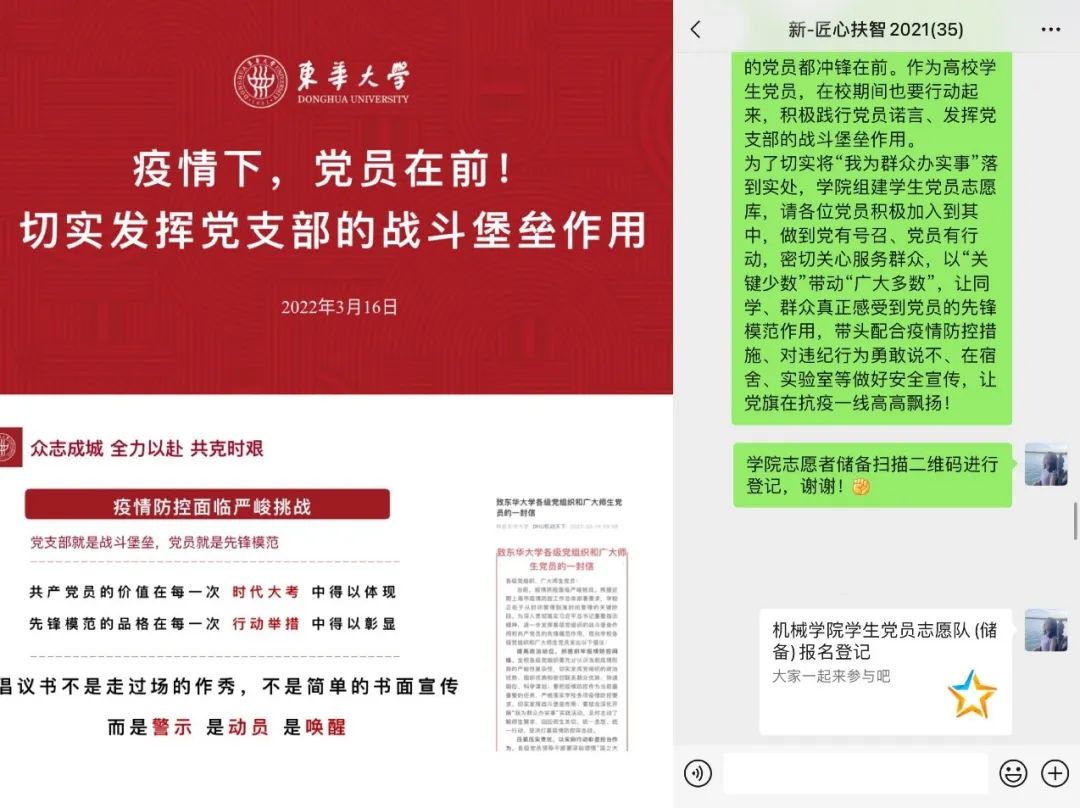“一名党员就是一面旗帜”,支部党员快速响应公司号召,全员加入到公司党员志愿服务队,助力校院秩序维持、物资配发、信息统计等防疫保障工作,争当疫情防控中的“战斗员”;发挥专业优势,成立“党支部、团支部、寝室”三位一体的学业帮扶岗,用匠心争当云端学习中的“宣传员”,以实际行动让党旗在抗疫一线高高飘扬!