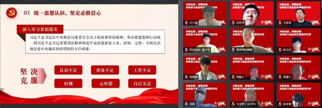 公司6个教工党支部与13个员工党支部结对联学,通过校内外视频连线等形式开展“冲锋在前、顽强拼搏,发挥战斗堡垒和先锋模范作用”主题党日活动,充分发挥教师党员对员工的关心和帮扶作用。机械电子工程教工党支部与机械211、212硕员工党支部、机械213硕员工党支部联学,号召师生党员牢记党员身份责任,积极投身疫情防控工作,做到听令而动、闻令而行,全国高校“黄大年式教师团队”负责人、上海市优秀党员师德标兵孙以泽教授发言“要在疫情防控中锤炼和检验党性”,并勉励研究生党员,“把疫情挡在门外的同时,也做到学习和科研的精神缺位,科技自立自强的脚步不停歇”。