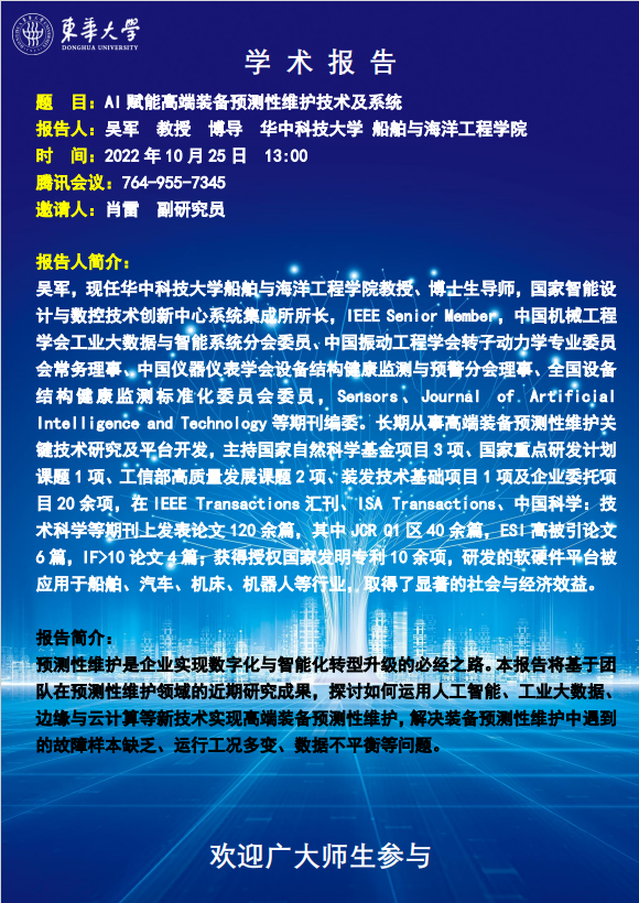 吴军,现任华中科技大学船舶与海洋工程公司教授、博士生导师,国家智能设计与数控技术创新中心系统集成所所长,IEEE Senior Member,中国机械工程学会工业大数据与智能系统分会委员、中国振动工程学会转子动力学专业委员会常务理事、中国仪器仪表学会设备结构健康监测与预警分会理事、全国设备结构健康监测标准化委员会委员,Sensors、Journal of.Artificjal Intelligence and Technology 等期刊编委:长期从事高端装备预测性维护关 键技术研究及平台开发,主持国家自然科学基金项目3项、国家重点研发计划课题1项、工信部高质量发展课题2项、装发技术基础项目1项及企业委托项目20余项,在IEEE Transactions 汇刊、ISA Transactions、中国科学;技 术科学等期刊上发表论文120余篇,其中 JCR Q1 区40 余篇,ESI 高被引论文6篇,IF>10论文4篇;获得授权国家发明专利10余项,研发的软硬件平台被应用于船舶、汽车、机床、机器人等行业,取得了显著的社会与经济效益。