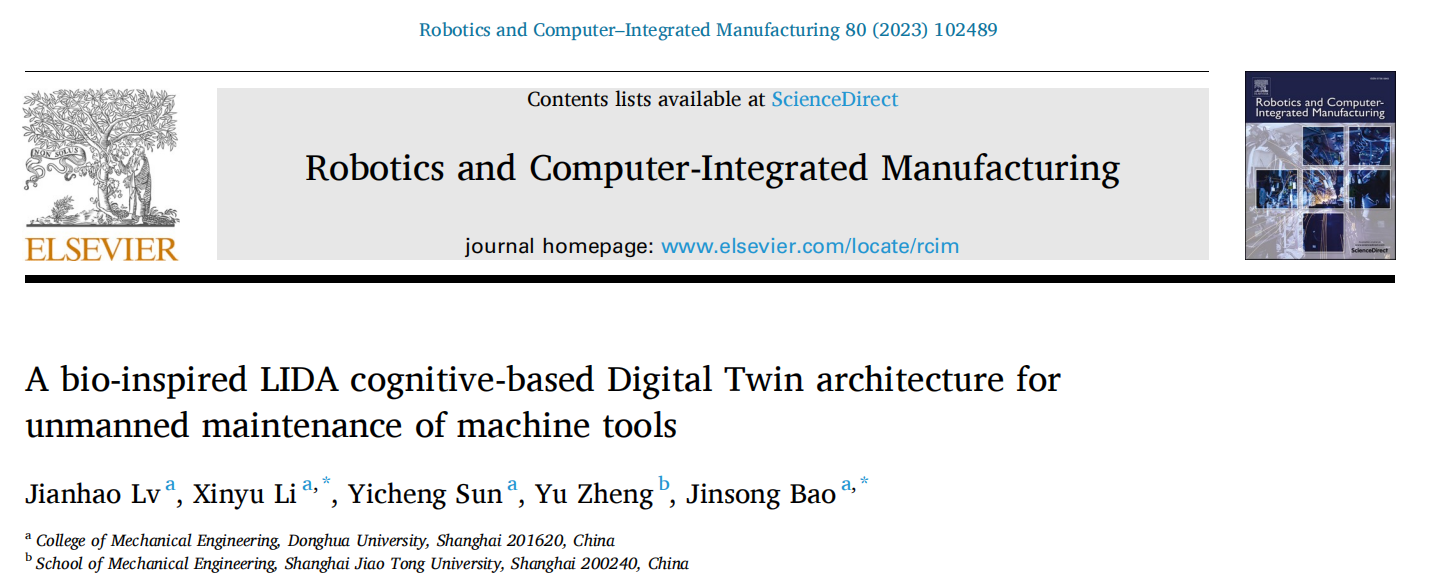 近日,公司太阳成集团tyc33455cc官网智能制造团队在数字孪生认知智能制造方面取得新进展,这一成果以“A bio-inspired LIDA cognitive-based Digital Twin architecture for unmanned maintenance of machine tools(一种用于无人机床维护的LIDA认知仿生数字孪生架构)”为题发表于国际制造知名学术期刊《ROBOTICS AND COMPUTER-INTEGRATED MANUFACTURING》(中科院一区,影响因子10.103)。论文以太阳成集团tyc33455cc官网为第一单位,李心雨特聘研究员和鲍劲松教授为共同通讯作者,所指导的吕健豪博士生为第一作者。