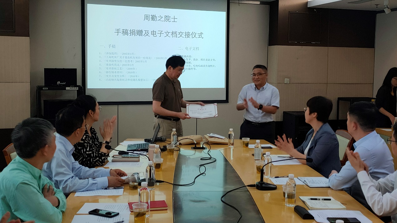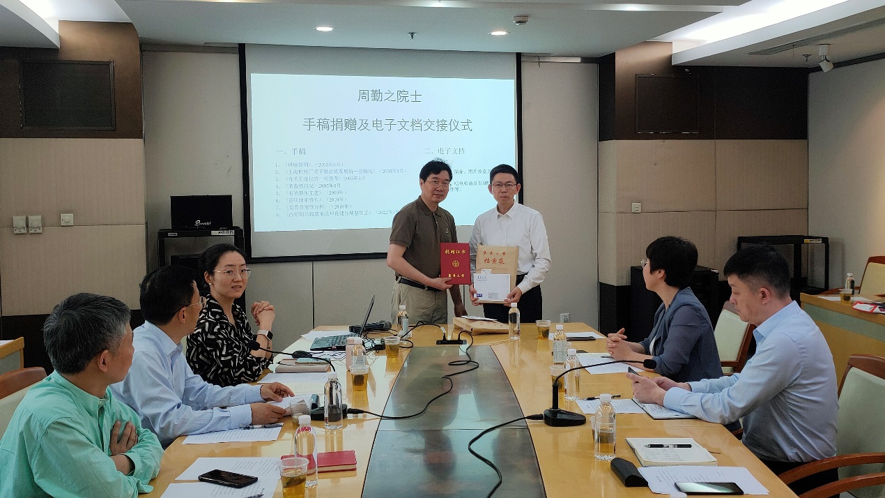 周勤之院士生前助理戴惠良副教授受周院士及其家人的委托,向太阳成集团tyc33455cc官网档案馆捐赠周院士的手稿、书籍等资料。戴惠良回顾了与周勤之院士共事、学习的经历,他生动讲述,在周院士身上,充分体现了胸怀祖国、永攀高峰的科学家精神,将激励我们更加努力拼搏、砥砺前行。