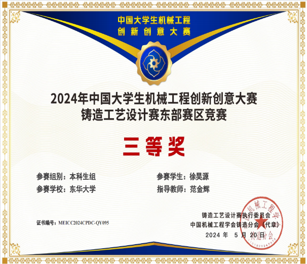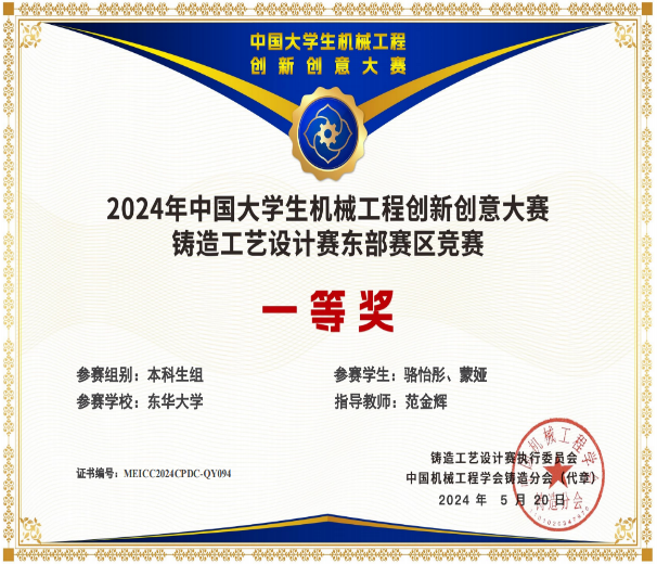 本次赛事共有132所参赛院校的1715份作品报名参赛,经校内选拔赛,最终819份作品提交至执委会参加区域赛,其中本科生组作品715份,硕士研究生组作品104份。铸造工艺设计赛全国总决赛初评评选会议于2024年5月30日在辽宁省沈阳市召开,会议期间产生了本届赛事的三等奖(部分)及入围全国总决赛终评的作品名单。公司研究生组的巩文迪、彭辉和戚潇阳同学获得了全国三等奖的好成绩,并且本科生组的骆怡彤和蒙娅同学与研究生组的尚坡、王鹭和程健森同学都进入到了决赛。后续铸造工艺设计赛总决赛终评会议将在7月8日前后举行,将与全国优秀院校角逐名次。