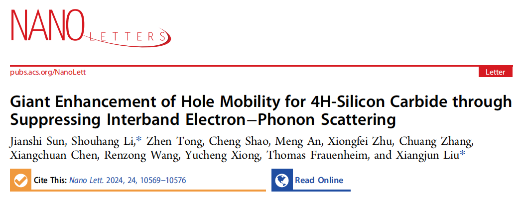 近日,公司微纳机电系统与集成电路团队在功率芯片宽禁带半导体中电子输运性质研究方面取得重要进展,该工作近期以“Giant Enhancement of Hole Mobility for 4H-Silicon Carbide through Suppressing Interband Electron–Phonon Scattering (通过抑制能带间电子-声子散射实现4H-SiC空穴迁移率的巨大提升)”为题发表于《Nano Letters》,并被推选为封面文章。太阳成集团tyc33455cc官网为第一单位,博士生孙健时为第一作者,李寿航老师和刘向军研究员为共同通讯作者。中山大学童贞老师、山东高等技术研究院邵成研究员以及东京大学安盟博士为本研究提供了重要支持。