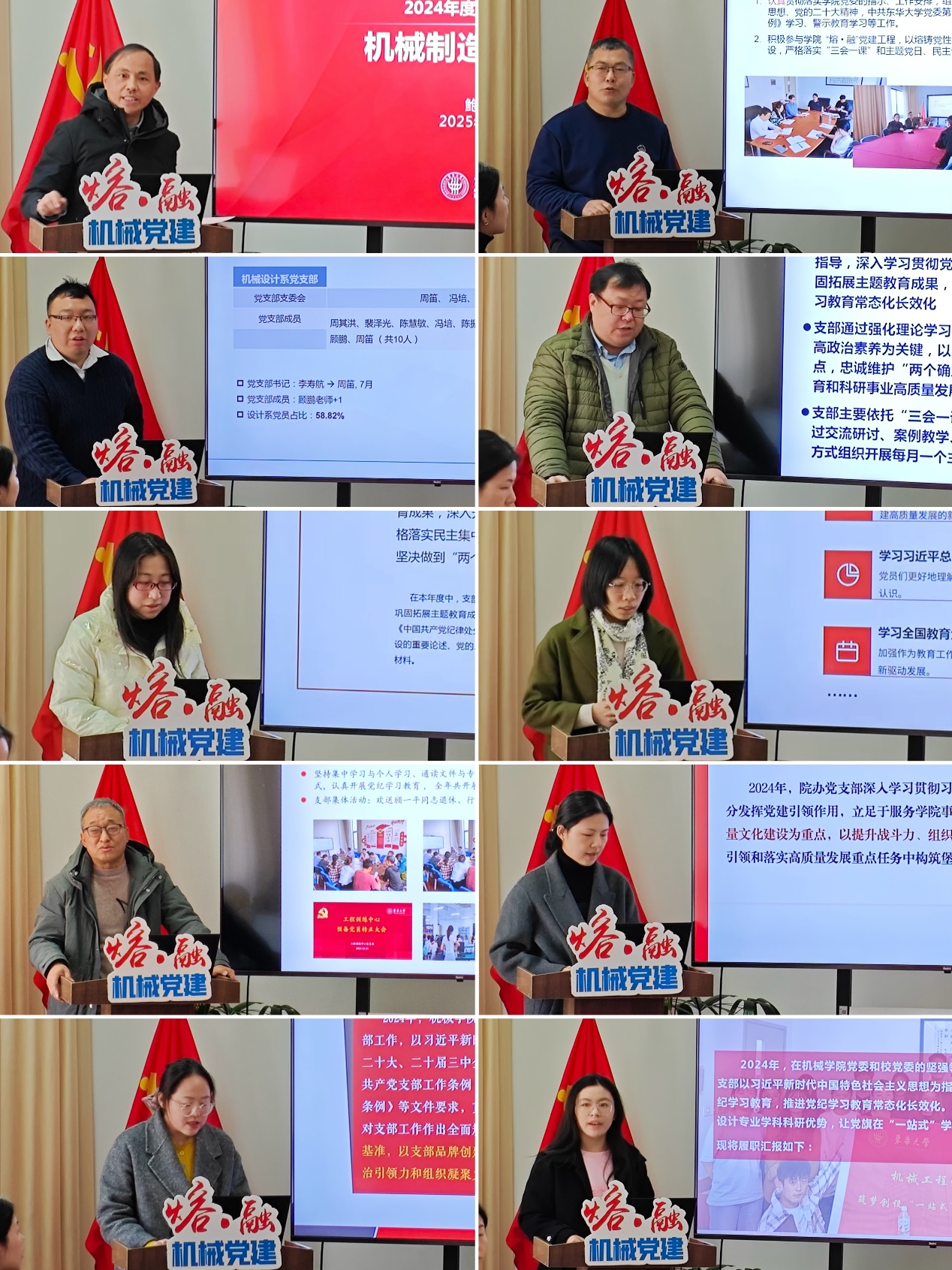 会上,机械制造系党支部书记鲍劲松、机械基础系党支部书记白云峰、机械设计系党支部书记周笛、机械电子系党支部书记盛晓伟、工业设计系党支部书记倪敏娜、机械实验中心党支部书记陈玉洁、工程训练中心党支部书记原一高、公司办公室党支部书记黄璐、筑梦创设本科生党支部书记王晓晖、筑梦创设“一站式”员工社区党支部书记王婷等10位同志分别就支部党建工作作了述职,既客观总结成绩、展示成果,又直面问题、深入分析原因,厘清了进一步改进工作的思路与规划。