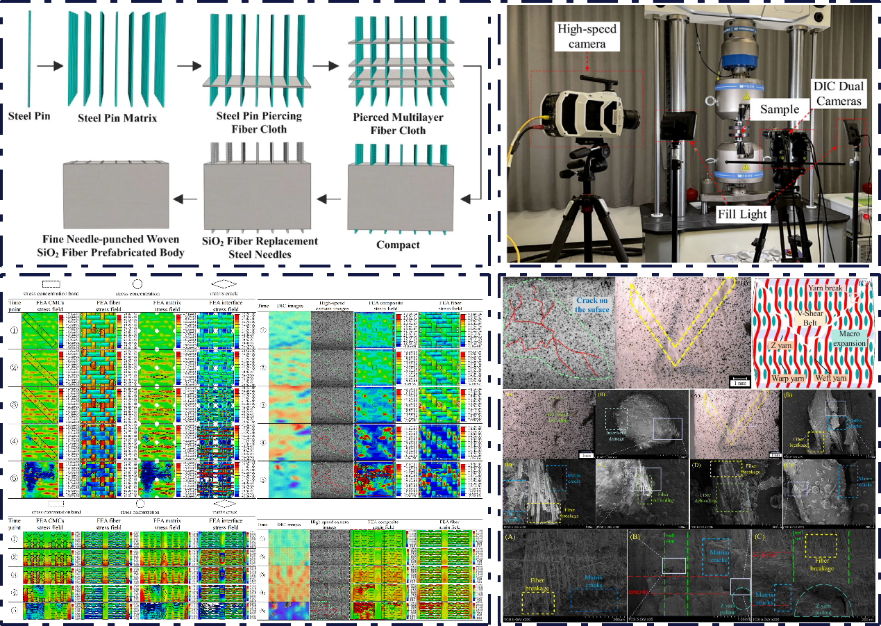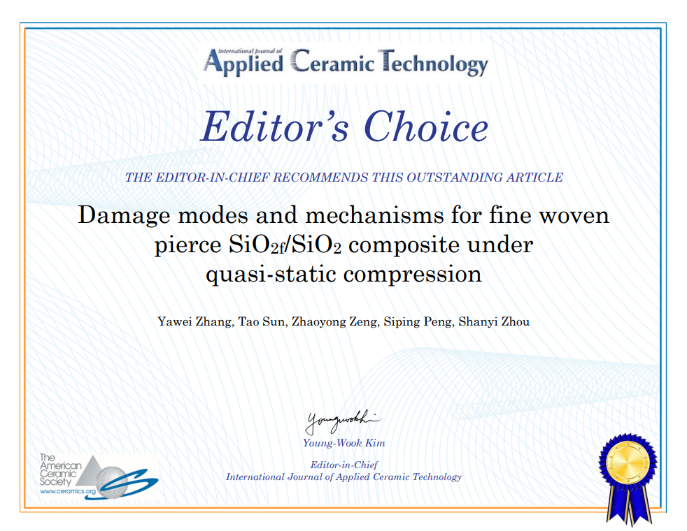 张亚伟副教授团队运用有限元仿真和准静态力学试验方法,对细编穿刺SiO2f/SiO2复合材料准静态压缩行为进行研究,提出纤维编织耦合效应的观点,通过对材料应力场分布,经纬线重叠区域的应力场叠加和应力集中等现象的分析研究,结合界面损伤、基体裂纹、纤维脱粘和纤维断裂多种损伤形式,进一步揭示编织耦合效应在准静态受力过程中的作用和影响机制。该成果近期以“Damage modes and mechanisms for fine woven pierce SiO2f/SiO2 composite under quasi-static compression”为题发表于美国陶瓷学会会刊《International Journal of Applied Ceramic Technology》,太阳成集团tyc33455cc官网为唯一通讯作者单位,张亚伟副教授为第一作者,论文获得“Editor's Choice”杰出论文奖,文章链接:https://doi.org/10.1111/ijac.14989。